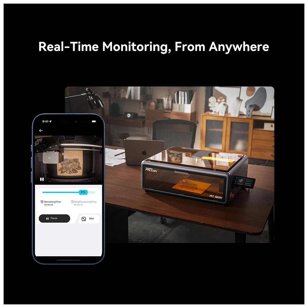 Buďte kreatívni bez obmedzení. Vďaka aplikácii Falcon Design môžete sledovať laserovanie v reálnom čase, okamžite reagovať na možné riziká a dokonca si vytvoriť ohromujúce časozberné videá vašich projektov – všetko priamo cez smartfón.