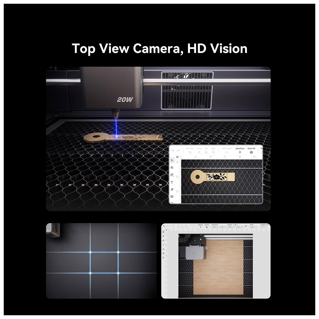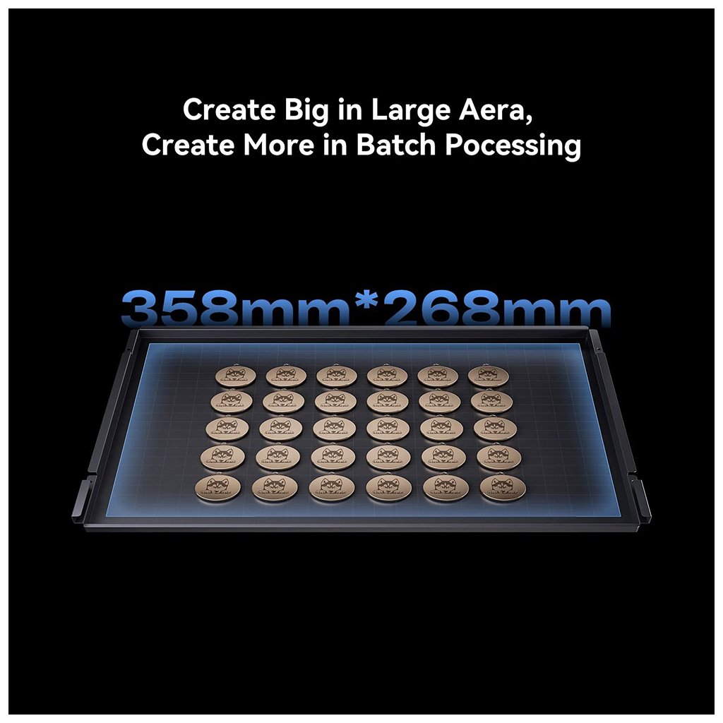 20W + 2W IR voliteľný, pracovná plocha 358*268 mm, rýchlosť 600mm/s, bezkontaktný autofocus, smart kamera, 4.3" dotykový displej, bezplatný PC softvér, mobilná aplikácia
