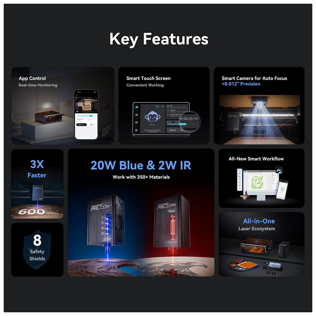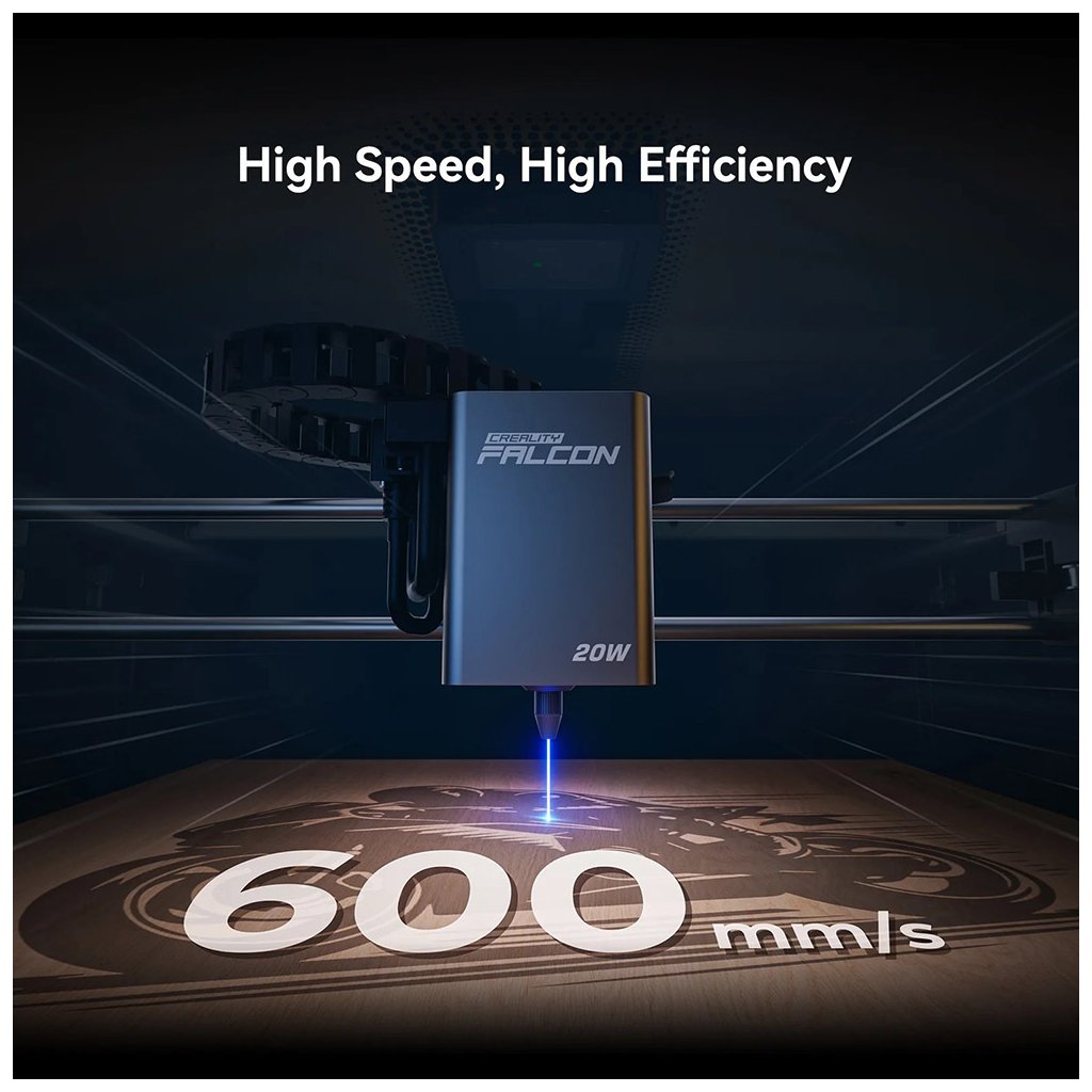 Nezáleží, či ide o drobné detaily alebo veľké projekty. Falcon A1 Pro pracuje rýchlosťou až 600 mm/s a pritom si zachováva plynulosť a maximálnu presnosť.